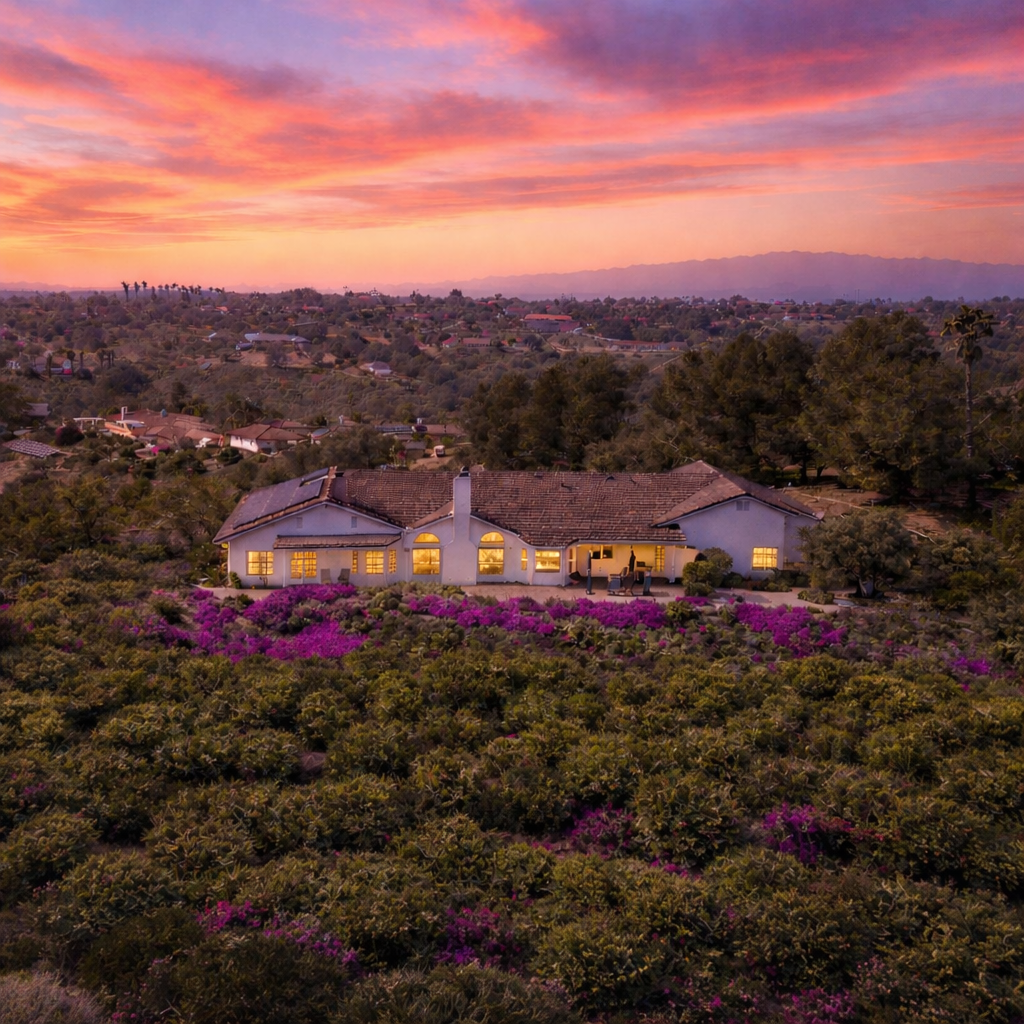Perched atop the rolling hills of Fallbrook, this exceptional property captures nearly 360 degrees of panoramic views, showcasing breathtaking sunrises, vibrant sunsets, and the natural beauty of Southern California’s countryside. Surrounded by renowned wineries, scenic hiking trails, and horseback riding experiences, the location offers both tranquility and lifestyle appeal.